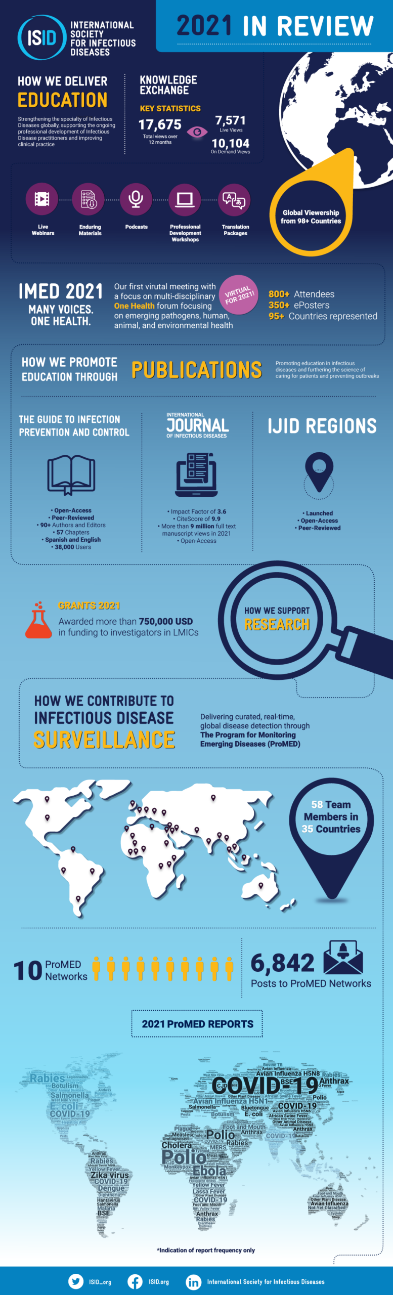 Highlights from ISID’s global education initiatives, research funding, and infectious disease surveillance—strengthened through ProMED and international collaboration.