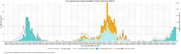 The current 2025–26 season is following a distinct pattern, with early activity beginning in mid to late November and exclusive detection of A(H3N2) to date. Genomic data indicate substantial diversity within circulating H3N2 viruses, with subclade K (J.2.4.1) accounting for approximately half of sequenced cases. Together, these observations suggest an earlier H3N2-led season in 2025–26, shaped by ongoing antigenic drift and altered population immunity.