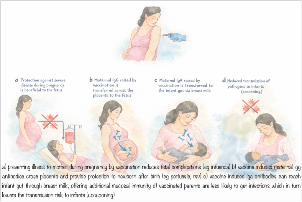 Newborns have immature immune systems and limited ability to fight infections. Some of the most dangerous infections in early infancy such as tetanus, influenza, pertussis, and Respiratory Syncytial Virus (RSV), either cannot be fully prevented by vaccination at birth or cause severe disease before routine immunization schedules take effect. Maternal vaccination elegantly bridges this gap. It does not replace infant vaccination; it complements it by providing protection during the most critical early window of life. The logic is simple but powerful: protect the mother, and you protect the baby.